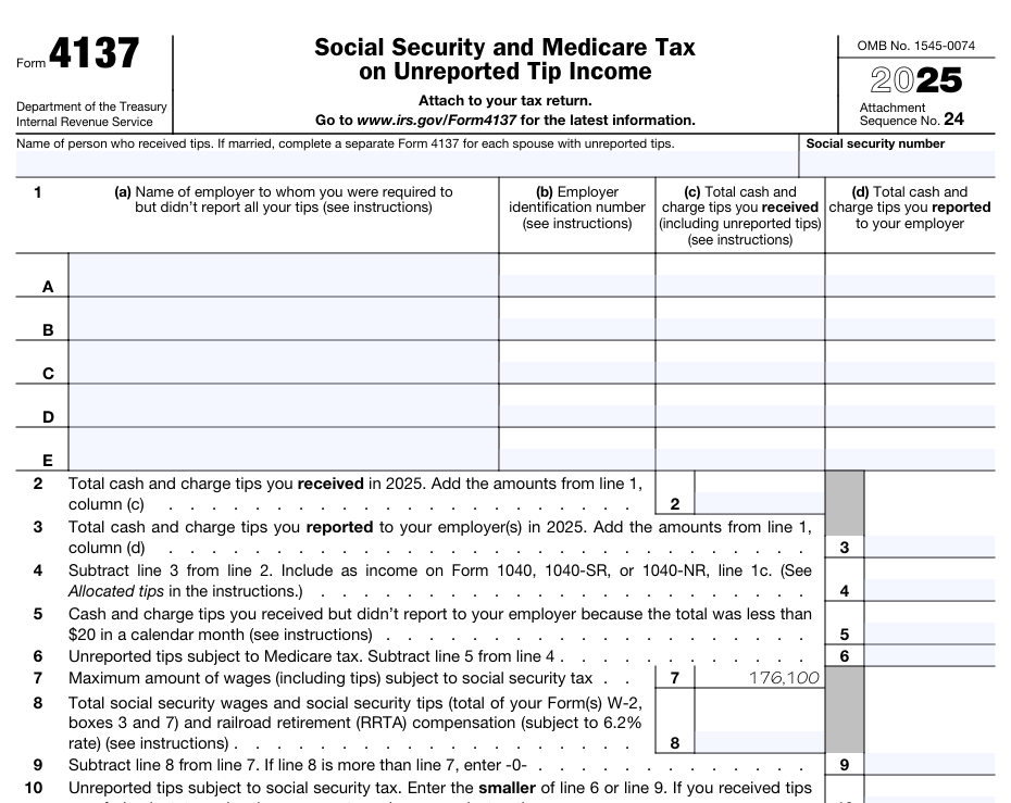 - Form 4137 필요 없음 (모든 팁을 제때 보고함)