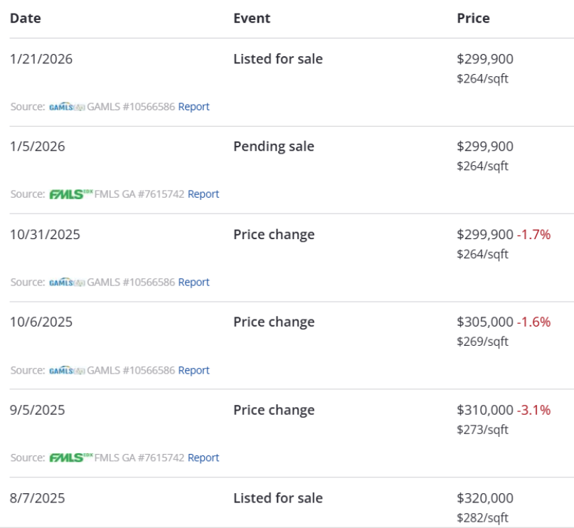 - 2026년 1월 5일: $299,000에 계약이 체결되어 실사 진행 중에 취소됨