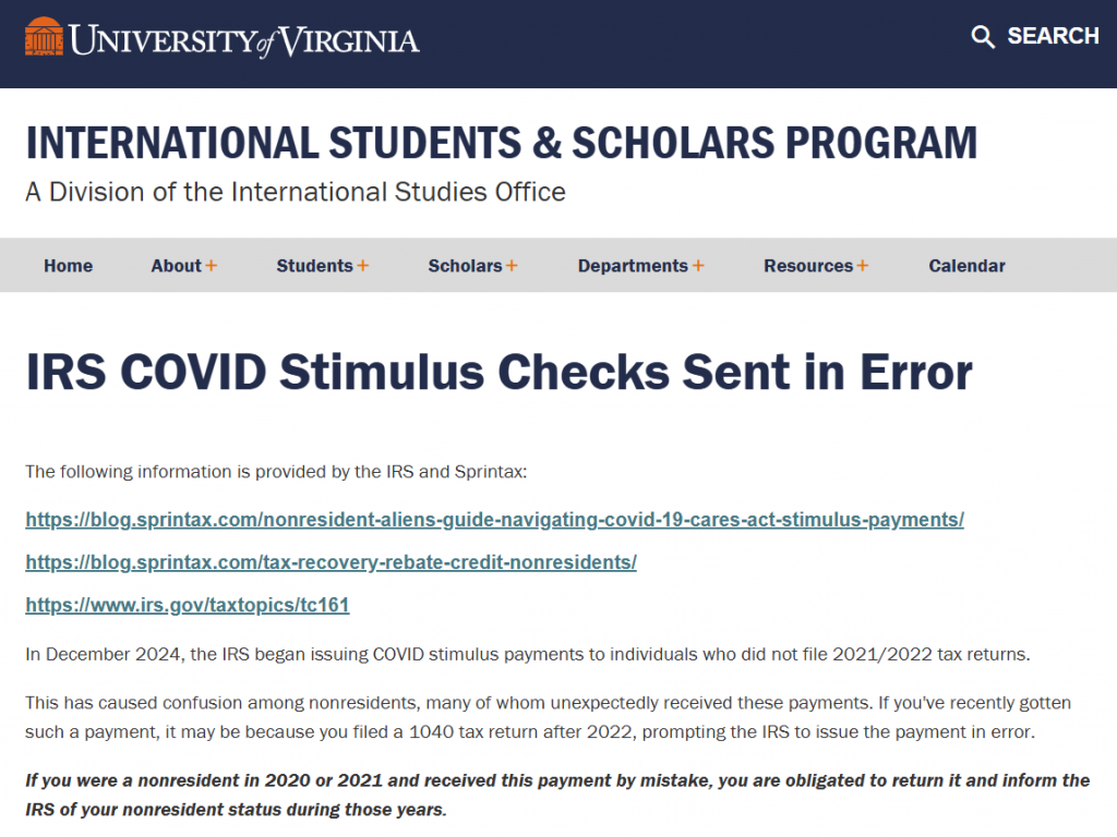University of Maryland의 TerpTax에서도 2025년 1월 22일, 일부 F-1 학생들이 IRS로부터 예상하지 못한 $1,400 지급을 받고 있으며, 2021년에 Nonresident Alien이었다면 이 금액을 IRS에 반환해야 한다고 안내했습니다.